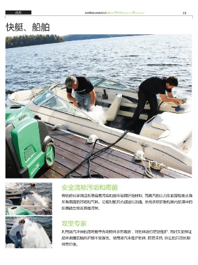 应用 全球最佳绿色清洁方式 奥斯卡® 蒸汽机(Optima® Steamer) 25 快艇、船舶 安全清除污垢和霉菌 传统的化学清洁剂很容易污染和损坏玻璃纤维材料, 而蒸汽的压力则能温和地去除 所有表面的污垢和气味。它能对船只内部进行消毒, 杀死柔软织物和室内装潢中的 细菌微生物及其他污秽。 攻坚专家 利用蒸汽冲掉船底附着甲壳动物并杀死霉菌,对船体进行定期维护, 同时又能保证 船体表面的蜡保护膜不受损害。使用蒸汽来维护船体, 防范未然, 保证船只的长期 转售价值。